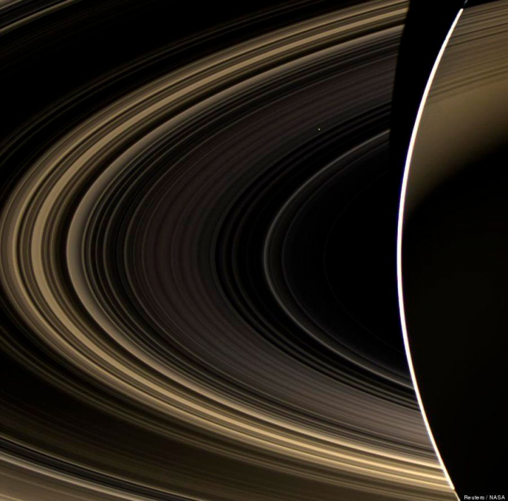 El arco brillante en la parte derecha de la imagen es Saturno. Una porción de los anillos se recorta contra la cara de Saturno, que a su vez está débilmente iluminado por la luz solar dispersada por los anillos.