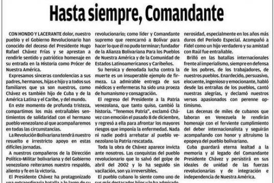 El diario oficial del PC cubano incluye en su web la declaración del Gobierno despidiendo a Chávez con un "Hasta siempre, Comandante". Utilizan una frase de José Martí ("A todas las grandezas reales, el tiempo las aumenta, no las apaga") par...
