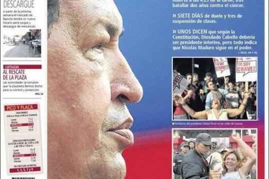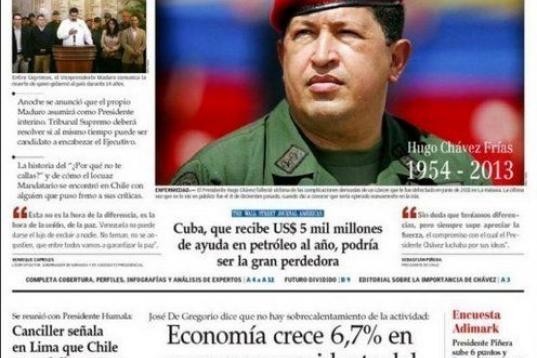 El diario chileno dedica la mayor parte de su portada en la edición de papel a la muerte de Chávez. En una de las piezas, destacan que, si Venezuela da un giro político, "Cuba podría ser la gran perdedora", por los acuerdos económicos que C...
