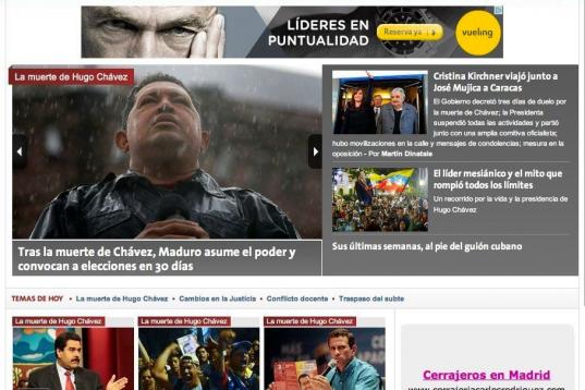 El diario argentino destaca que la presidenta del país, Christina Krchner, ya se ha desplazado a Venezuela. "El líder mesiánico, el revolucionario, el mito que rompió todos los límites", titulan su obituario.