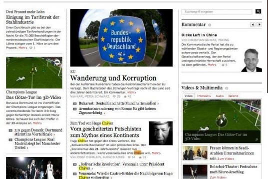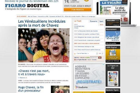 La web francesa dedica la mayor parte de su portada a la muerte de Chávez y destaca en la noticia principal que el ejército se ha desplegado para "garantizar la paz". "De militar a presidente", es otra de sus piezas de resumen. Y, en el obitua...