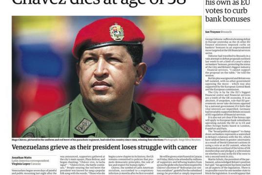 El diario británico lleva la muerte de Chávez en la parte de abajo de su portada. Su muerte deja en Venezuela "lágrimas... y una nación dividida", apuntan.