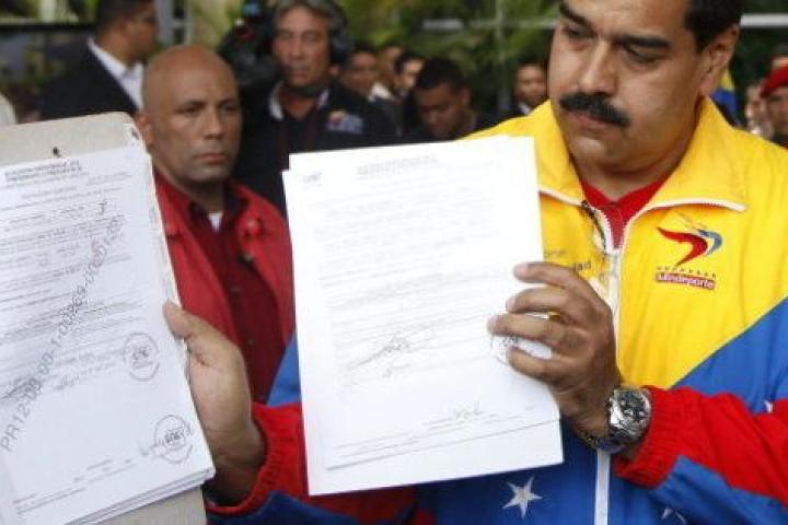 Maduro entregó "en nombre del comandante Hugo Chávez" y del pueblo el "programa de la patria" y se comprometió a cumplirlo desde 2013 al 2019. Vestido con una chaqueta con el tricolor de la bandera venezolana, el presidente encargado llegó a la sede del órgano electoral, en el centro de Caracas, en un autobús y entre gritos de "Con Chávez y Maduro el pueblo está seguro" y "No volverán".