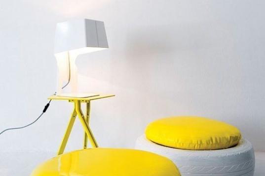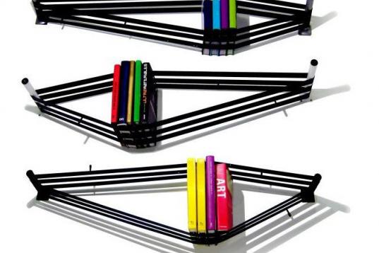 Estantería hecha con neumáticos usados de bicicletas, colocados de forma tensionada sobre dos patas de muebles