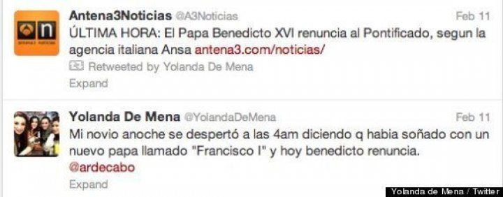 Alejandro R. de Cabo, @Ardecabo en Twitter, es el joven español (madrileño de 22 años, según su perfil en la red social) que tuvo un "sueño premonitorio" que ha convertido a esta pareja en noticia (y, para muchos, en lo más divertido de la elección del nuevo Papa). Lo contó su novia en Twitter el 11 de febrero: "Mi novio anoche se despertó a las 4am diciendo q había soñado con un nuevo papa llamado "Francisco I" y hoy Benedicto renuncia". El tuit de Yolanda de Mena se convirtió en viral ayer y, en el momento de escribir estas líneas, tiene 43,836 retuits. La joven se define en su perfil de Twitter como "joven publicista de ESIC": si esto hubiera sido (o es) una campaña orquestada le hubiera salido redonda porque ha sido todo un éxito.