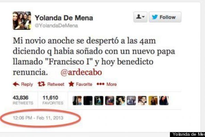 Alejandro R. de Cabo, @Ardecabo en Twitter, es el joven español (madrileño de 22 años, según su perfil en la red social) que tuvo un "sueño premonitorio" que ha convertido a esta pareja en noticia (y, para muchos, en lo más divertido de la elección del nuevo Papa). Lo contó su novia en Twitter el 11 de febrero: "Mi novio anoche se despertó a las 4am diciendo q había soñado con un nuevo papa llamado "Francisco I" y hoy Benedicto renuncia". El tuit de Yolanda de Mena se convirtió en viral ayer y, en el momento de escribir estas líneas, tiene 43,836 retuits. La joven se define en su perfil de Twitter como "joven publicista de ESIC": si esto hubiera sido (o es) una campaña orquestada le hubiera salido redonda porque ha sido todo un éxito.