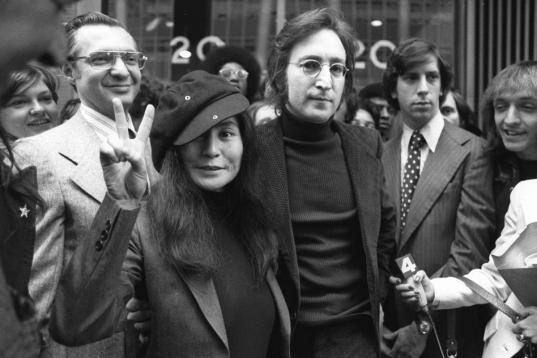Former Beatle John Lennon and his wife Yoko Ono are shown talking to newsmen outside the U.S. Immigration offices in New York on Wednesday in March, 1972. At the hearing on his deportation, the defense submitted a petition containing 16,000 sign...