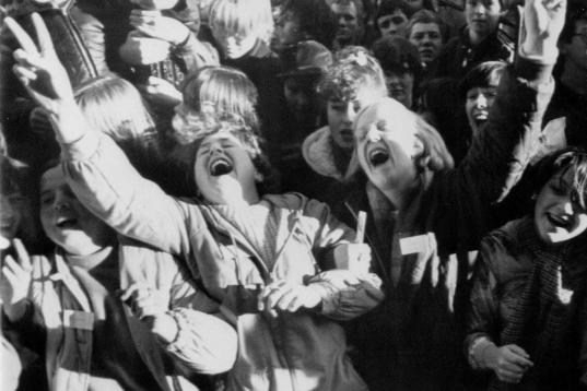 Beatles John Lennon continues to play the guitar as he evades a young fan who wants Lennon's yachting-style cap as a souvenir during the Beatles concert in Rome, Italy, June 28, 1965.