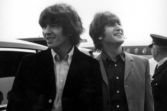George Harrison and John Lennon from the Beatles pictured to looking at some of the hundreds of fans who turned up to see them leave London Airport for their trip to America.