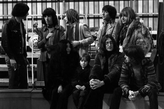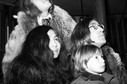 Julian Lennon (front) with his father John Lennon (right) of the Beatles, Japanese actress Yoko Ono (left) and Brian Jones of the Rolling Stones (back) at a rehearsp of the Rolling Stones' Rock and Roll Circus at the Intertel Studio, Wembley, Lo...