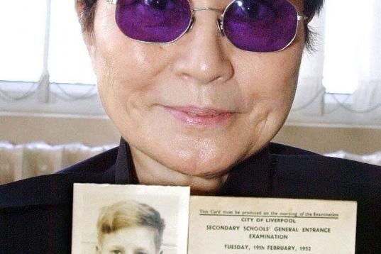 Musician and artist Yoko Ono, widow of Beatles singer John Lennon, holds aloft a picture of her late husband, when he was a youngster in Liverpool.