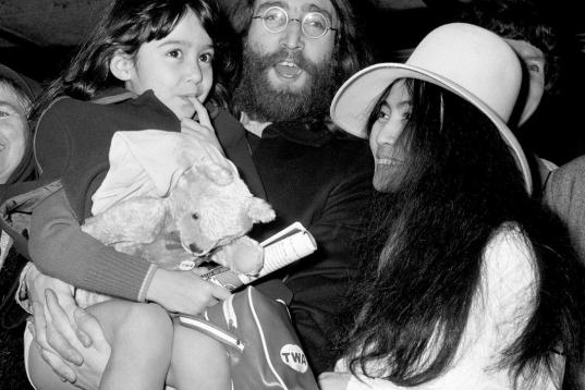 John Lennon, holds Kyoko Cox, the 6 year old daughter of his Japanese wife, Yoko Ono, on the child's arrival at Heathrow airport, where she had flown in from New York.