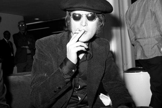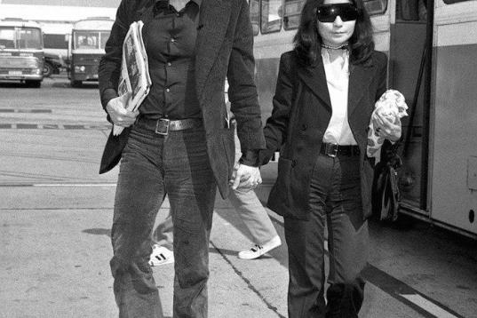 Beatle John Lennon and his wife, Yoko Ono, left, at an airport at an unknown location.