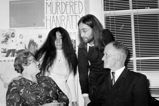 10/12/69 :IN FRONT OF A POSTER THAT READS "BRITAIN MURDERED HANRATTY", JOHN LENNON AND YOKO ONO TALK WITH MR. AND MRS. JAMES HANRATTY, PARENTS OF THE DEAD MAN, AT A PRESS CONFERENCE IN LONDON TO DISCUSS THE FILM IT IS PLANNED TO MAKE CONCERNING ...