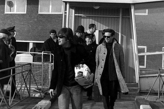 JOHN LENNON LEADS IN THE FOREGROUND AS "THE BEATLES" WALK OUT OF THE LONDON AIRPORT LEAVING THE QUEEN'S BUILDING (BACKGROUND) ON THEIR RETURN FROM FILM-MAKING IN THE BAHAMAS, 1965.