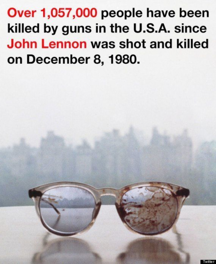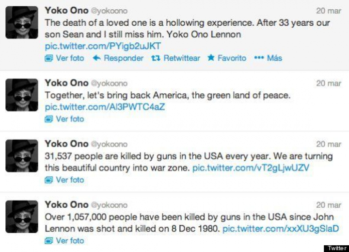 Ono ha compartido la fotografía en cuatro tuits. "31,537 personas mueren por armas en EEUU cada año. Estamos convirtiendo este precioso país en una zona de guerra", ha denunciado para luego pedir que se vuelva a la América "verde tierra de paz". En su último mensaje, la artista ha recordado que "después de 33 años" su hijo Sean y ella aún echan de menos al famoso intérprete de Imagine.