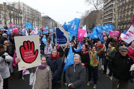 La manifestación, en la que abundaron las pancartas en las que se leía "todos nacimos de un hombre y de una mujer", "papá, mamá y los hijos ¡Es natural!" y "la manifestación por todos", tuvo lugar en torno al Arco del Triunfo, después de que las autoridades prohibieran que recorriera los Campos Elíseos, tal y como habían solicitado los organizadores.