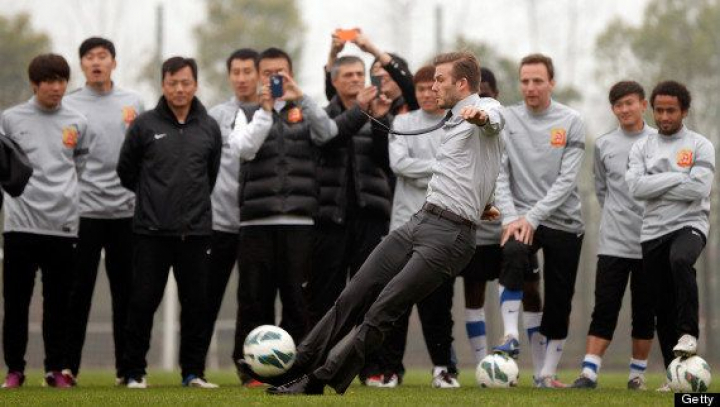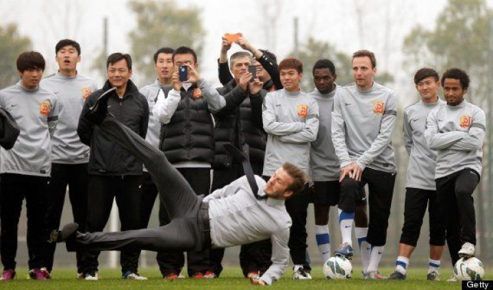 En el acto, la superestrella del fútbol y la publicidad vestía un traje gris combinado con una camisa blanca y zapatos negros. Así de elegante se pegó un batacazo cuando se animó a realizar unas jugadas con unos futbolistas chinos: perdió el equilibrio y terminó sufriendo una caída de espaldas, eso sí, sin perder la sonrisa. ESTO es caerse con elegancia:
