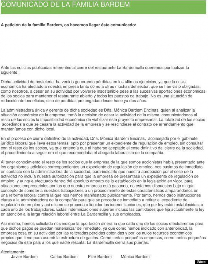 Sin embargo, cuando los otros socios tuvieron conocimiento de la presentación del ERE ante los organismos judiciales correspondientes, le comunicaron que su aprobación del cese de la actividad "no incluía" su autorización para que la empresa presentase el referido expediente. "No estamos dispuestos bajo ningún concepto a someter a nuestros trabajadores a un procedimiento de estas características amparándonos en una reforma laboral contra la que nos hemos manifestado públicamente", subraya la familia Bardem en el comunicado.