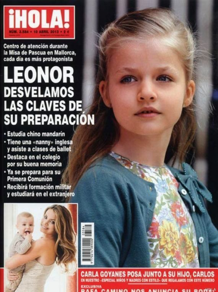 La revista Hola regala el dato en su portada de esta semana, dedicada a educación de la pequeña. Sobre una fotografía de la niña tomada en la última misa de Pascua, apunta datos como que estudia ballet, tiene una 'nanny' inglesa, se prepara para su Primera Comunión y que "destaca en el colegio por su buena memoria". La revista, además, avanza que como su padre, seguirá una formación militar y estudiará en el extranjero.