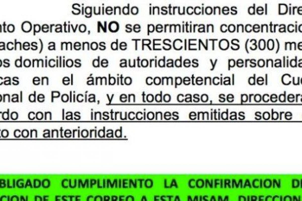 Sin embargo, el Sindicato Unificado de la Policía (SUP) ha publicado una nota en la que reproducen la orden difundida por el Ministerio a las comisarías en la que se puede leer la indicación de prohibir los escrache a menos de 300 metros.