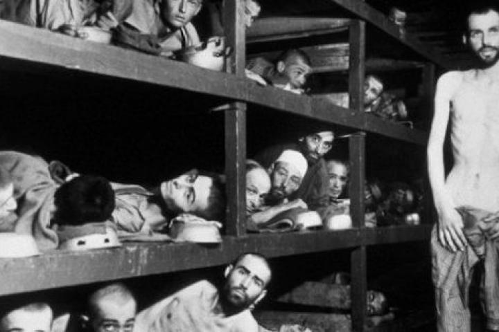 Prisiones del campo de concentración de Buchenwald, en sus literas. Entre ellos figura Elie Wiesel, futuro escritor y ganador del Premio Nobel de la Paz: es el séptimo por la izquierda en la segunda fila de literas (justo al lado de la madera).