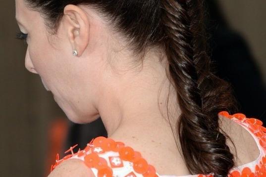 La actriz Hana Mae Lee con tocado de colilla gigante y el actor Will Ferrel