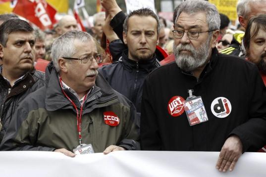 Ambos han exigido en la Puerta del Sol, al término de la manifestación en Madrid, un Pacto de Estado para impulsar el crecimiento, y volver a situar a los trabajadores en el centro de la política económica. Los dos han rechazado también las políticas de ajustes que impone la UE.