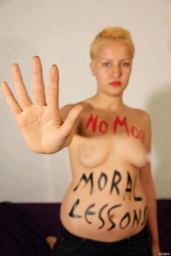 Al estilo de Femen, con el torso al descubierto, la joven de 19 años que había sufrido amenazas el pasado febrero por compartir varias imágenes similares a ésta en su página de Facebook, ha vuelto a denunciar la moral machista del Gobierno de Túnez después de semanas en las que no se había vuelto a saber nada de ella. En su cuerpo se puede leer en inglés, "No más lecciones de moral".