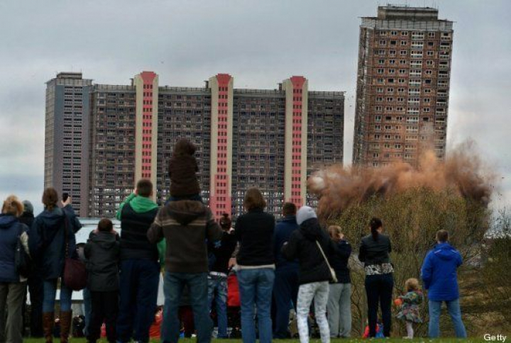 Uno de los rascacielos históricos del conjunto de Red Road de Glasgow, que en los 60 eran los edificios residenciales más altos de Europa, ha sido demolido en una explosión controlada, recogida en este vídeo de la BBC.