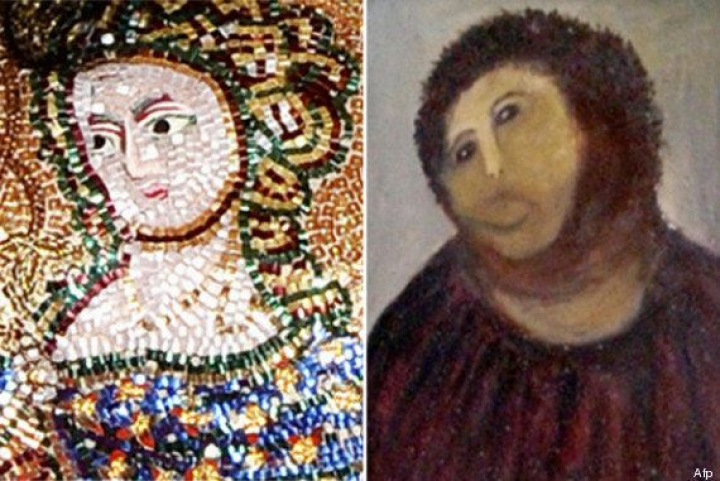 Ya nos pasó con los nuevos billetes de cinco euros. Así que, parafraseando al niño de El sexto sentido, confesamos que en ocasiones vemos... Cristos de Borja. Es mirar el vestido de Katy Perry, en la alfombra roja de la gala benéfica del Metropolitan de Nueva York, y acordarnos de Cecilia Giménez y su intervención en el ya famoso ecce homo, una de las imágenes virales de 2012.
