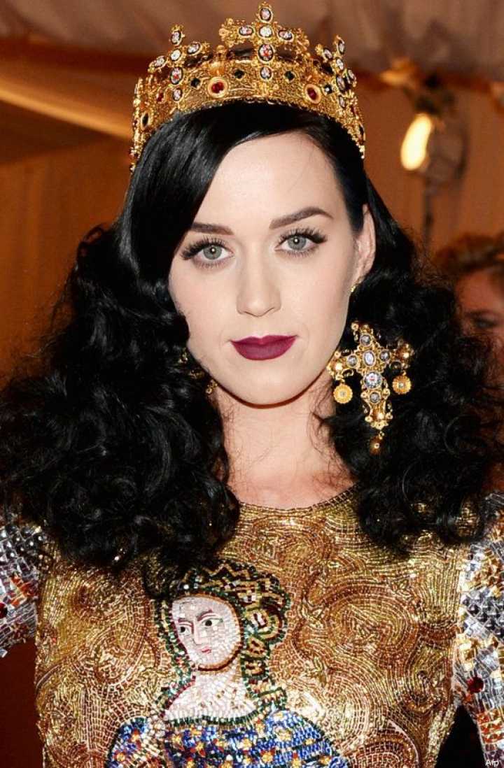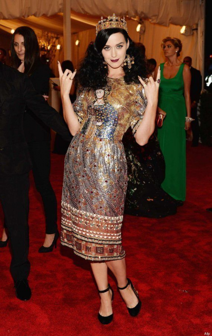 Katy Perry, en la tradicional gala benéfica del MET, lució un vestido de la colección otoño/invierno 2014 de Dolce & Gabbana, con clara inspiración religiosa. En concreto, el vestido de la cantante parece un homenaje al estilo ceciliesco de restauración de Cristos.