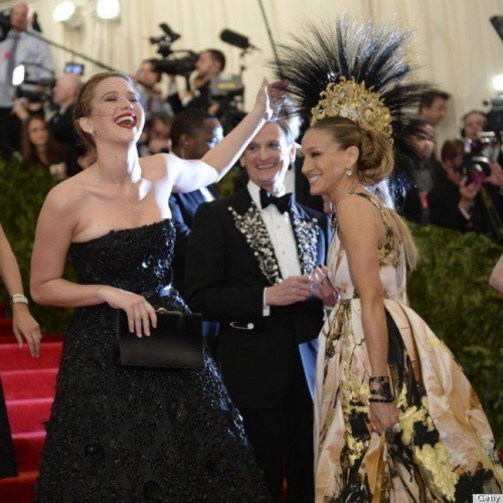 Un momentazo que dejó después una de las mejores fotos de la noche: Jennifer Lawrence muerta de risa mientras acaricia el tocado de Sarah Jessica Parker en la gala del MET 2013.