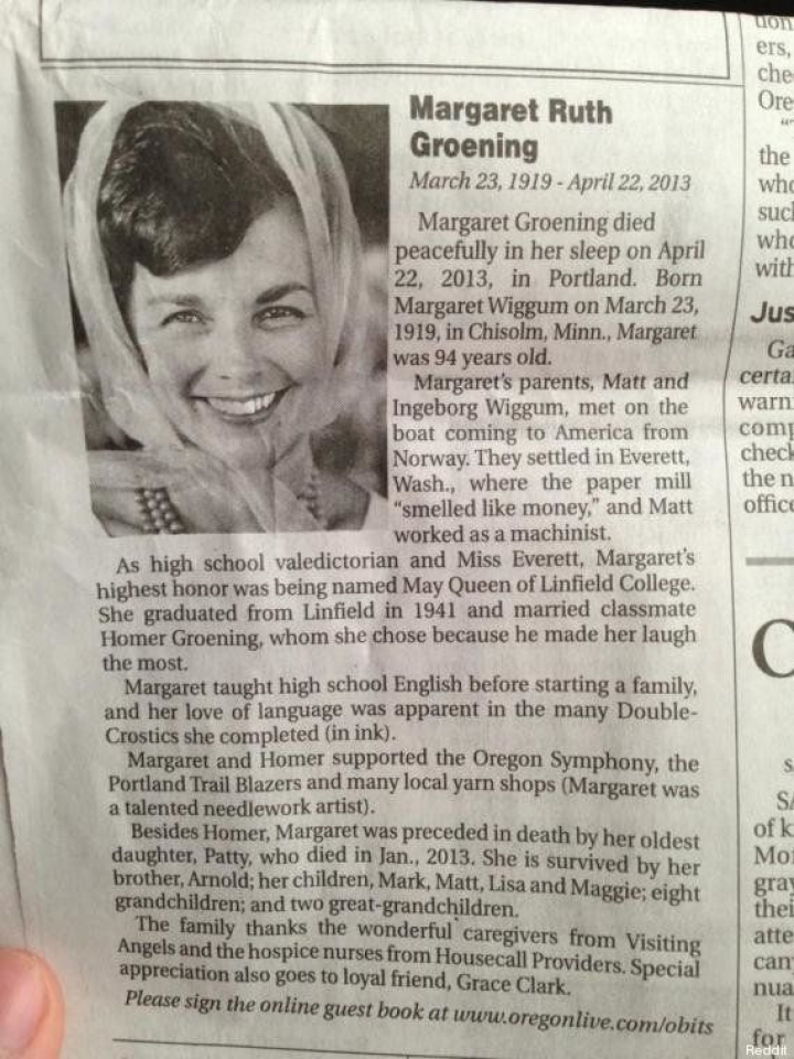 Margaret Ruth Groening falleció en Portland, en abril, a los 94 años. El obituario del diario The Oregonian se ha hecho popular en redes sociales después de que una foto del texto llegara a la web de compartir enlaces Reddit.