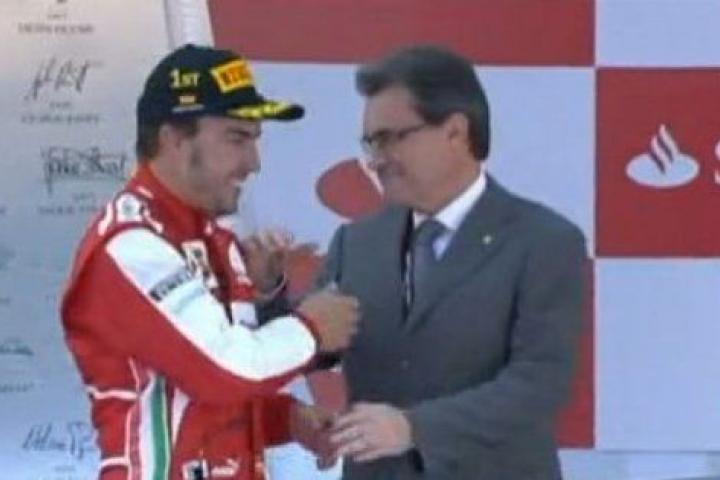 Alonso ha escuchado el himno de España cerca del presidente de la Generalitat de Cataluña, Artur Mas, y posteriormente Lobato ha señalado: "Estaba pensando yo qué papelón del presidente de la Generalitat, Artur Mas, con todo el lío que tienen ahora montado, escuchando el himno de España aquí en el circuito de Cataluña, ¿eh? Ha tenido que pasarlo mal".