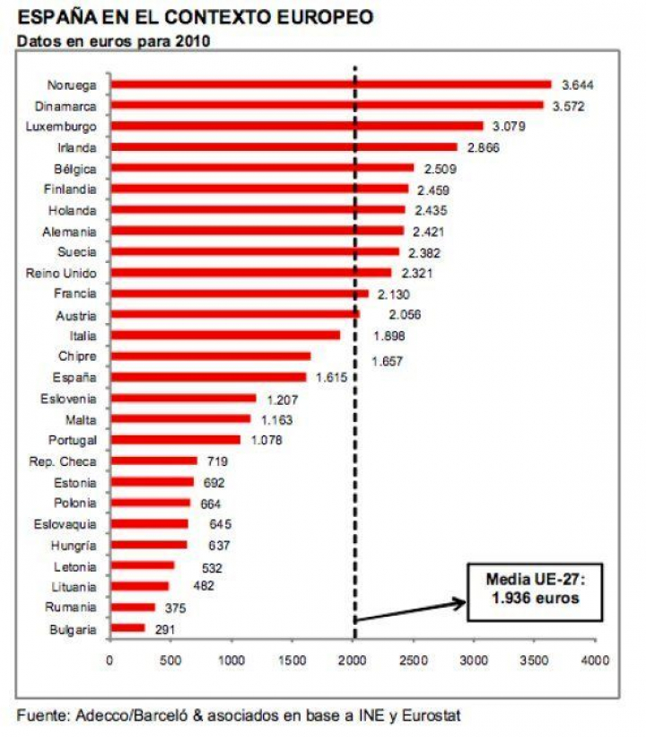 Además de ellos, el salario medio español resulta al menos un 34% inferior a las remuneraciones de Luxemburgo, Irlanda, Bélgica, Finlandia y Holanda.