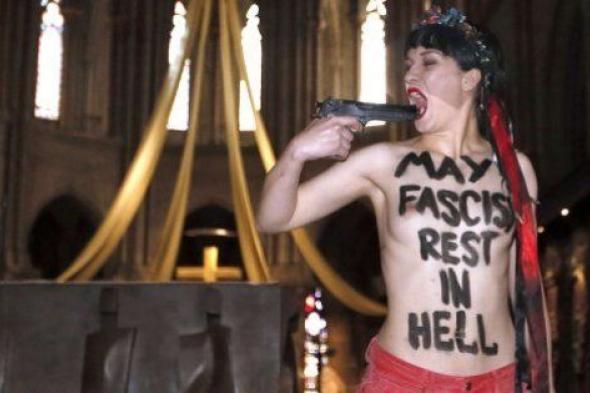 Medio día. Catedral de Notre-Dame en París. Una militante de la organización Femen se desnuda de cintura para arriba con un mensaje pintado sobre su pecho: "Que los fascistas descansen en el infierno". Es su peculiar manera de protestar por el suicidio de un conocido intelectual de extrema derecha en el interior de la catedral el pasado 11 de mayo.