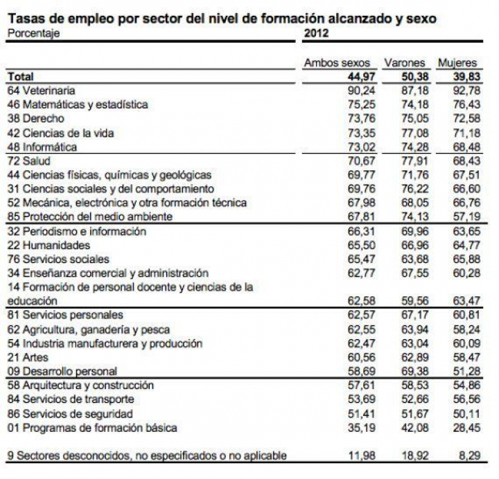 Le siguen en la lista Matemáticas y estadística, con una tasa de empleo por encima del 75%.