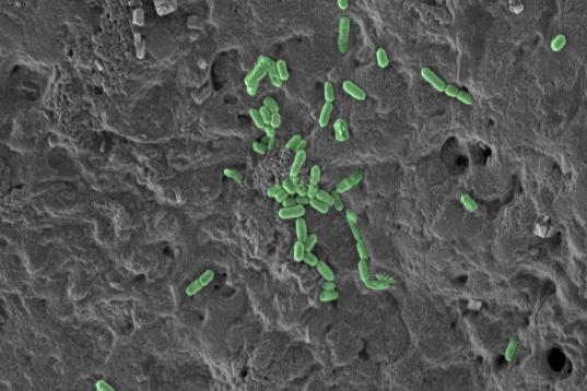 Listeria monocytogenes (en verde) en cecina de pavo.