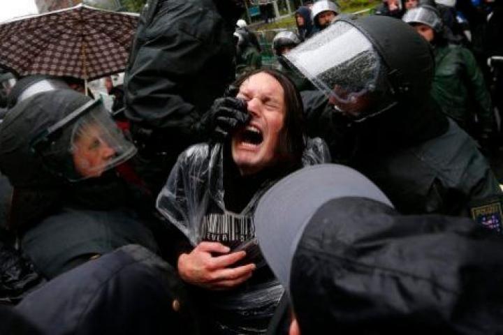 Según la Policía, el grupo estaba formado por unas 2.500 personas y al menos 20 manifestantes llevaban colchones hinchables con el lema 'la guerra comienza aquí'. Muchos han lanzado piedras, aunque, en esencia, la protesta estaba siendo pacífica, ha agregado.