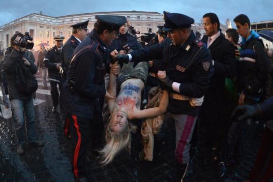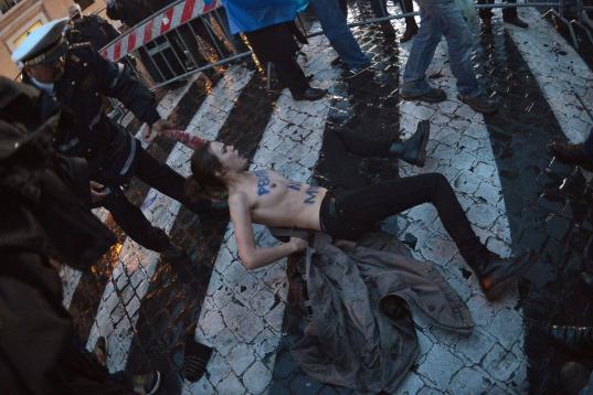 Las dos mujeres, en topless, llevaban escrito en sus cuerpos el mensaje "Heidi´s Horror Picture Show" (horrible espectáculo gráfico de Heidi). Los miembros de seguridad sacaron rápidamente a ambas activistas del plató.