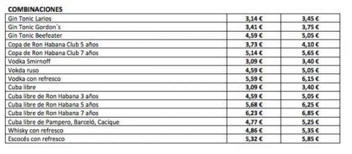 Llamaba la atención el bajo coste de las bebidas alcohólicas. Como los gin tonic, que variaban desde los 3,45 euros, el más barato, hasta el 5,05 euros, el más caro. O las copas de ron de marca: la más barata sale por 4,10 euros.