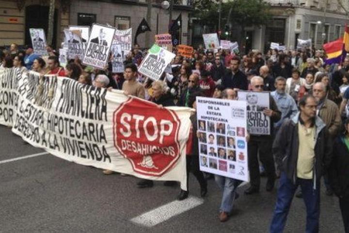 Miles de personas han participado este sábado en las manifestaciones convocadas por la Plataforma de Afectados por la Hipoteca (PAH) en Madrid, Sevilla, Lanzarote y Huelva "contra la impunidad financiera, contra la estafa hipotecaria y por el derecho de la vivienda".