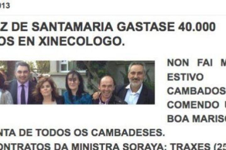 El concejal del Bloque Nacionalista Gallego en Cambados (Pontevedra) Xaquín Charlín González ha levantado la polémica con los calificativos dedicados a la vicepresidenta del Gobierno Soraya Sáenz de Santamaría en su blog personal. En él se refirió a Santamaría como "chochito de oro" en alusión al supuesto coste del contrato para sus reconocimientos ginecológicos.
