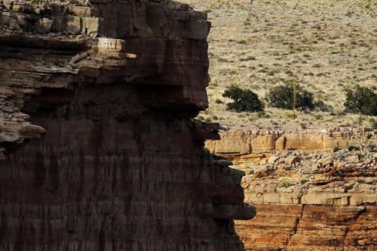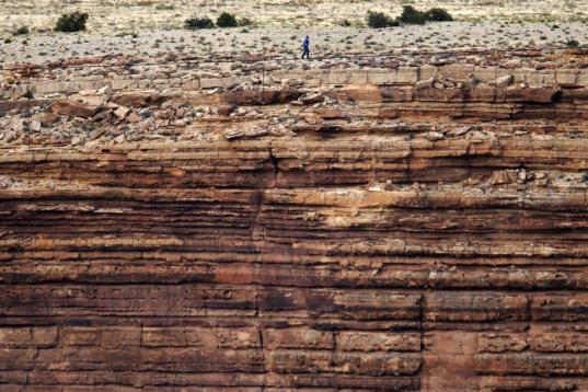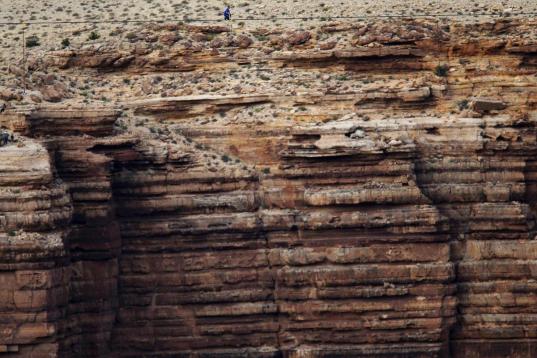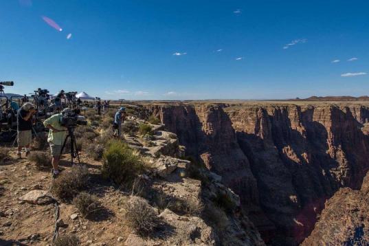 La caminata, que comenzó a la puesta del Sol cerca del Gran Cañón en Arizona, duró cerca de 23 minutos. La aventura, en la reserva navajo cerca de Cameron y fuera de los límites del Parque Nacional del Gran Cañón, se difundió con una dilación de 10 segundos en el Canal Discovery.
