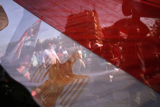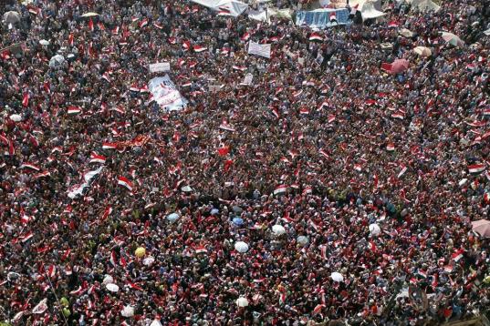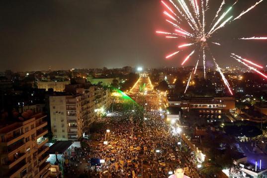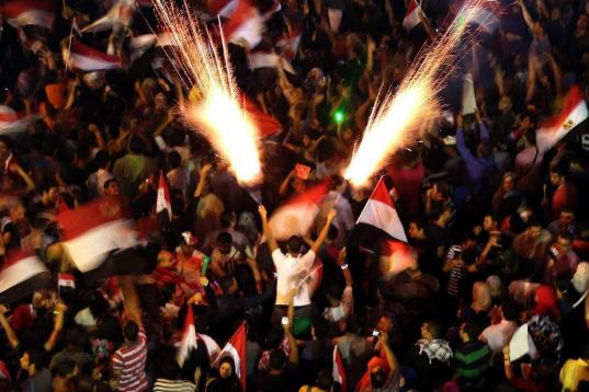 Mientras pronunciaba el discurso el jefe de los militares, la multitud que abarrota la plaza Tahrir ha estallado de alegría tras conocer la caída del Gobierno de Morsi. Bengalas y fuegos artificiales resonaban entre el griterío de los allí presentes.