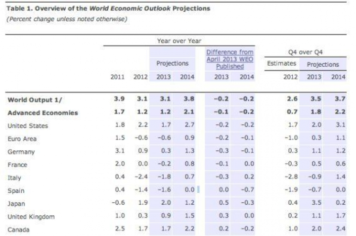 El Fondo enmarcó el dato negativo español en una "contracción más profunda de lo esperado" en la eurozona, para la que prevé un crecimiento negativo de 0,6 % este año, frente al 0,4 % estimado en abril, y una vuelta a la expansión del 0,9 % en 2014, también una décima menos que en su anterior informe.