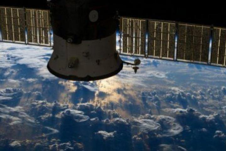 La foto fue tomada con una lente de 50 mm el 4 de julio por uno de los miembros de la Expedición 36 de la Estación Espacial Internacional. El pequeño espacio con reflejos del sol queda parcialmente oculto por un satélite ruso. Este es el espectáculo visual: