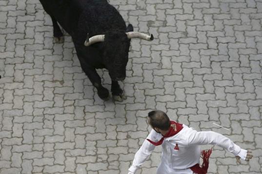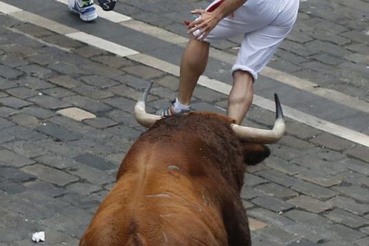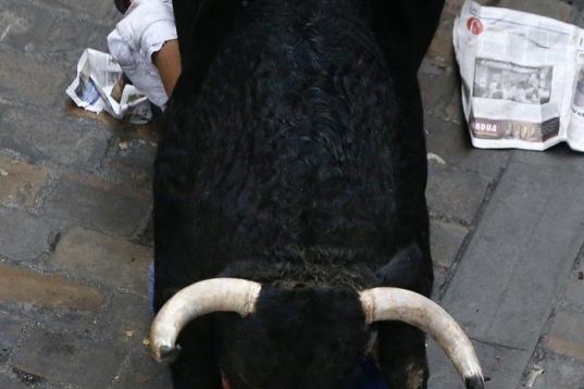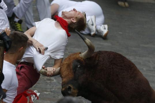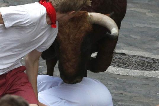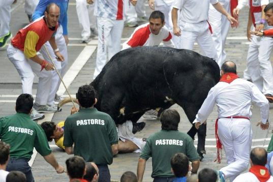 Ha sido a mitad de la Estafeta cuando ha embestido a un grupo de corredores y ha perdido el equilibrio y, al levantarse, cuando parecía que iba a continuar su camino, ha conseguido alcanzar a uno de esos mozos, lo ha tirado al suelo y le ha corneado durante un angustioso medio minuto.
