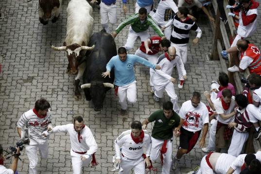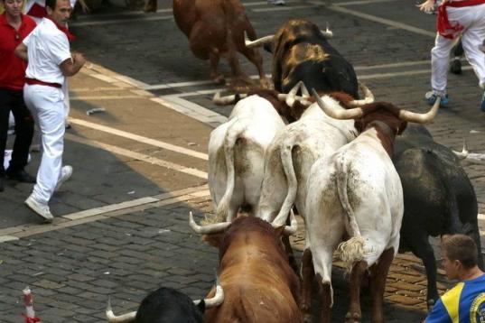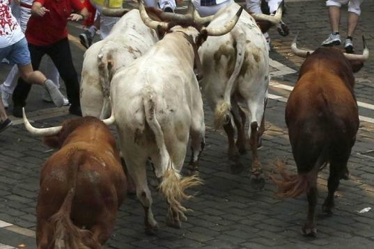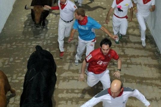 La torada ha atravesado la plaza del Ayuntamiento y ha empezando a separarse en grupos, una disposición en la que ha tomado la Curva sin problemas y ha enfilado la Estafeta, con tres cabestros y cuatro toros en cabeza, otro bravo a unos metros y el sexto, el que causaría los mayores problemas, ya comenzando a rezagarse.